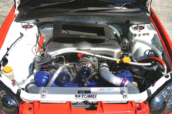 ⇑ ARISE EJ20中缸經過TOMEI POWERED改良及擴大氣缸口徑,令總排氣量提高2.2L,而油底隔油板亦是最新開發的製品,能有效地讓引擎在彎路傾側時保持油壓和油量,保持潤滑及散熱能力。