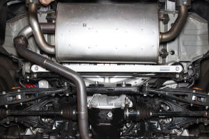 ● 從路面通過避震機,傳達至塔頂的壓力,加上車尾箱的大型開口,導致過彎時車身扭動。因此用頂巴連結左右懸掛的塔頂位置,便可提升車身剛性,有助發揮懸掛的本來功用,並能抑制過彎時的車身扭動,改善操控性和車頭穩定性。