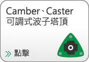 將「SUPER RACING」一直沿用的Camber(外傾角)、Caster(後傾角)可調式波子塔頂用於直立式的頭側避震機。一般波子塔頂是Camber可調式,但「MONO RACING」將它加以改良,連Caster也變成可調式。Camber和Caster可以獨立調整,Camber是不分段,Caster則可分為4個階段調整。 ※部份車種除外。 | |